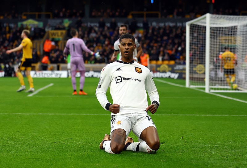 Soccer Football – Premier League – Wolverhampton Wanderers v Manchester United – Molineux Stadium, Wolverhampton, Britain – December 31, 2022 Manchester United’s Marcus Rashford celebrates scoring a goal that was later disallowed REUTERS/Molly Darlington EDITORIAL USE ONLY. No use with unauthorized audio, video, data, fixture lists, club/league logos or ‘live’ services. Online in-match use limited to 75 images, no video emulation. No use in betting, games or single club /league/player publications. Please contact your account representative for further details.
