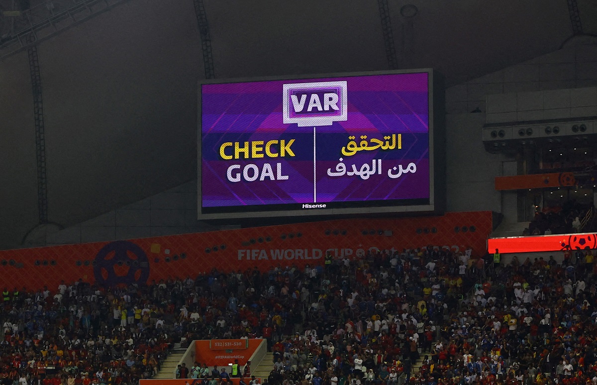 FILE PHOTO: Soccer Football – FIFA World Cup Qatar 2022 – Group E – Japan v Spain – Khalifa International Stadium, Doha, Qatar – December 1, 2022 A big screen displays a VAR review message before confirming Japan’s second goal REUTERS/Paul Childs/File Photo